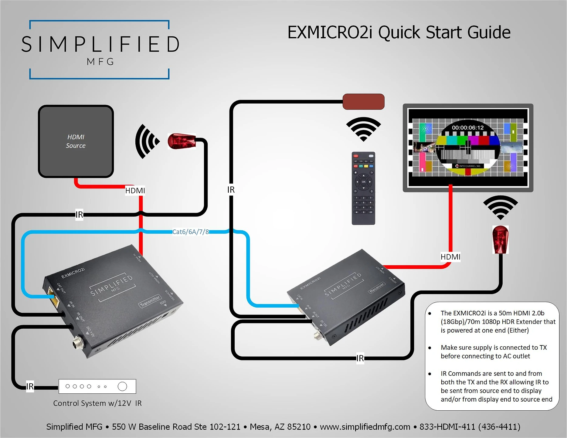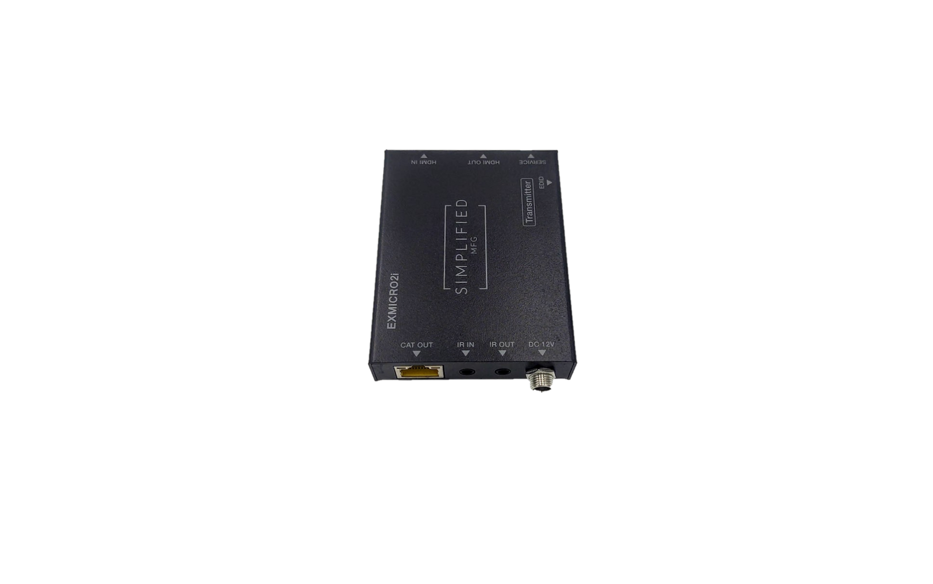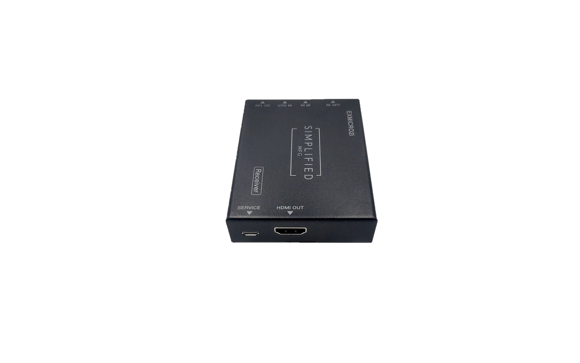 The EXMICRO2i is the latest in the Simplified MFG Micro line. It extends either 4K/UHD or 1080p HDMI signals up to 50m/164ft. The EXMICRO2i supports the entire HDMI 2.0b format including HDR and HDR+. The extender kit only requires power from one end (either) and has a 2-Way 12V IR kit included (one TX and one RX). There is also an innovative EDID circuit that allows for two preset EDID's (4K 60Hz. Stereo and 1080p 60Hz. Stereo. The other two settings allow for copy of the connected display at the RX or at the TX. In addition, this technology is more efficient than most only drawing about 1/3 the power (3.84W) of a typical extender set similar to its abilities. Small, efficient, effective.