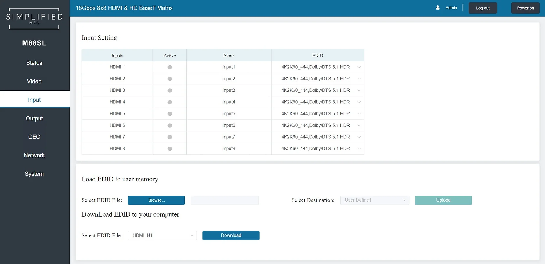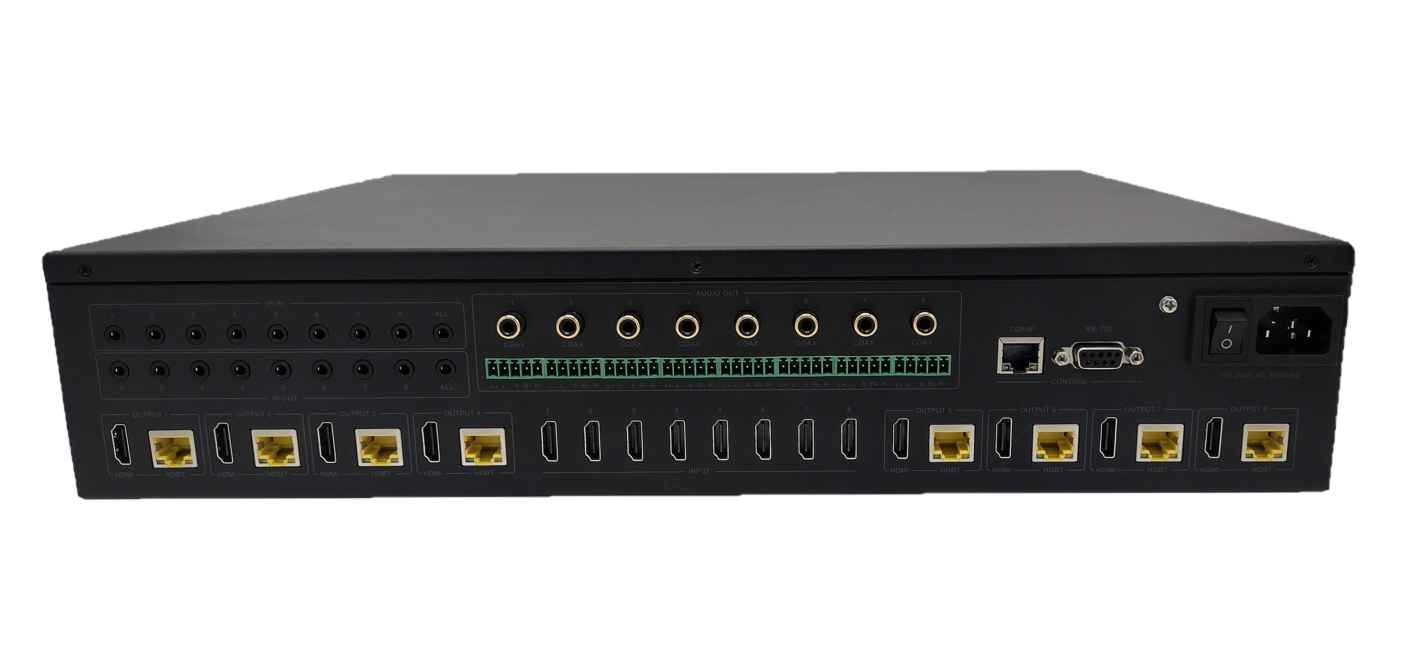 The M88SL features eight HDMI inputs, 8 x 18gbps Scaling HDBaseT outputs (120m @ 4K), and 8 Scaling HDMI outputs. There are audio breakouts (Coaxial and Phoenix) on each output, an IR transmit and receive bank, a sophisticated web GUI and the ability to be controlled via IP, RS-232, IR, or via manual buttons on the front panel. The M88SL provides true matrix routing for HDMI signals. It supports transmission of video (resolutions up to 2160p@60Hz Ultra HD 4:4:4) and supports high resolution audio formats such as LPCM7.1, Dolby TrueHD, Dolby Digital Plus, Atmos and DTS-HD Master Audio. The M88SL will also pass HDR8/10/10+ High Dynamic Range information as well as Dolby Vision. Each output can be set to scale independently of the other.