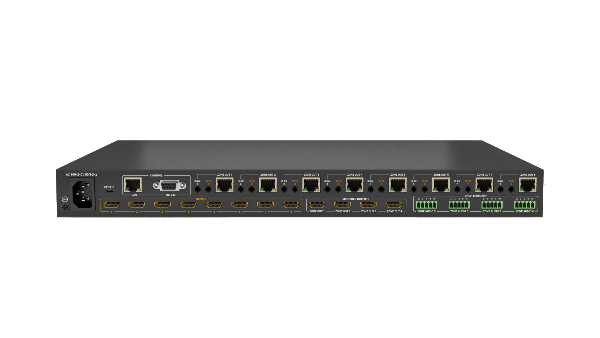 The MX-0808-KIT v2 gets a make over, sharing many of the same powerful features of version 1, but with a vision of lite commercial installations in mind. Offering the same transmissions of 4K UHD up to 35m/115ft, but now up to 8 HDBaseT outputs with included receivers. Additionally, version 2 is equipped with 4 mirrored outputs, whichcan be paired with any of our HAOC hybrid optical HDMI cables to connect to 4 additional screens. Also new and fitting are 4 balanced analog audio outputs 2ch support to connect to ceiling/over–hanging speakers or to an audio amplifier. Lastly, still enjoy the same great features of version 1, including CEC triggering, A/V mute and standby mode to extend the life of the matrix during downtime.